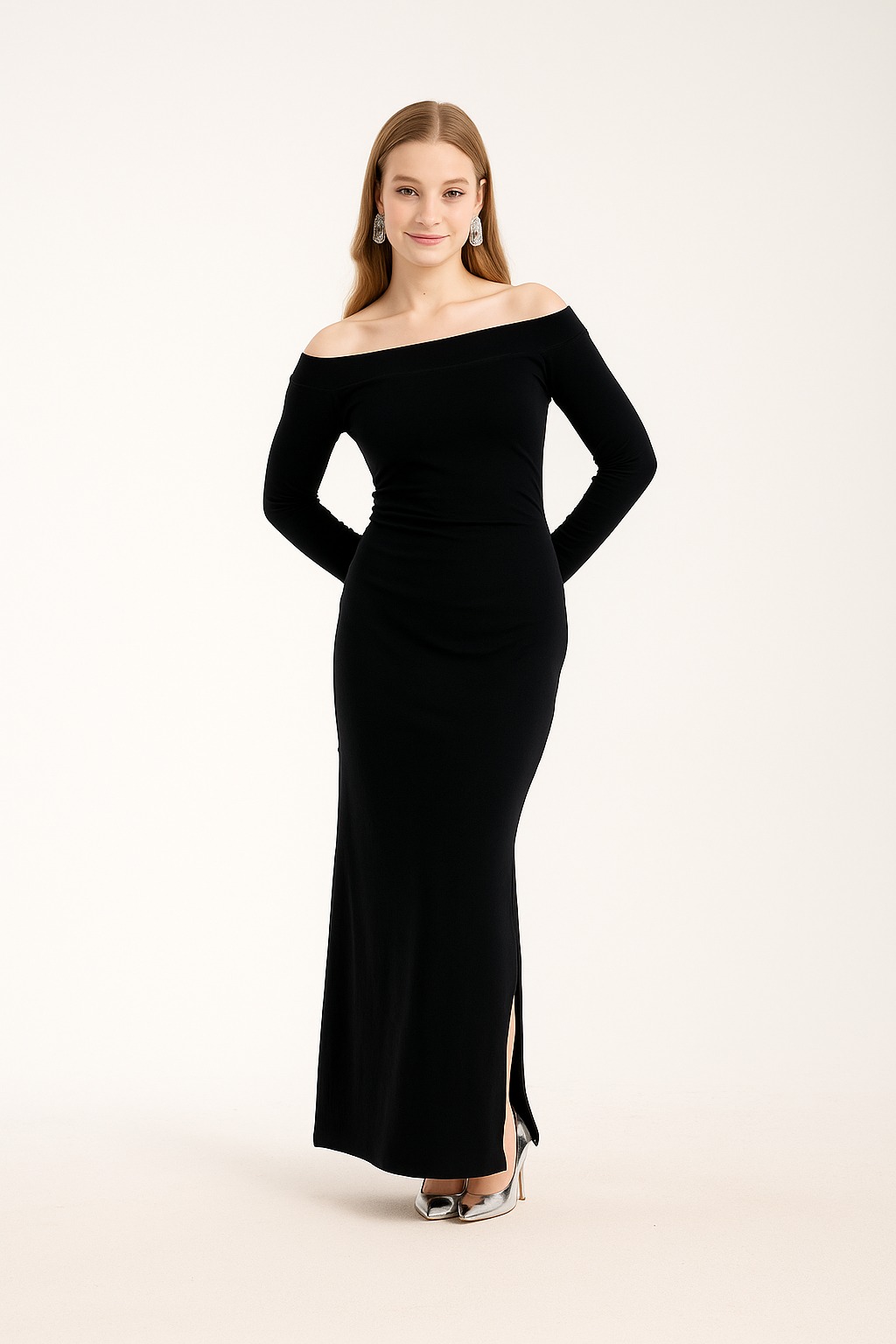 Siyah Omuz Dekolteli Bel Drapeli Yandan Yırtmaçlı Uzun Elbise